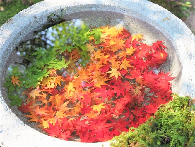 手水鉢に浮かべられた色づいたイロハモミジの葉▶