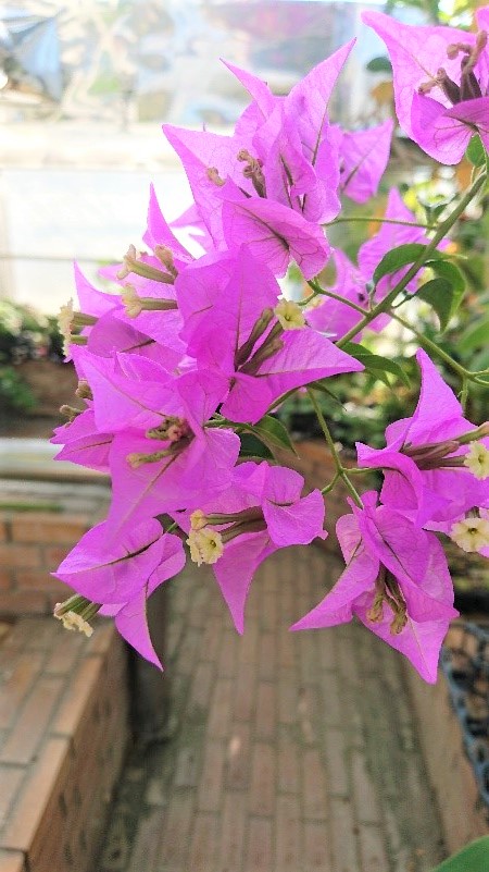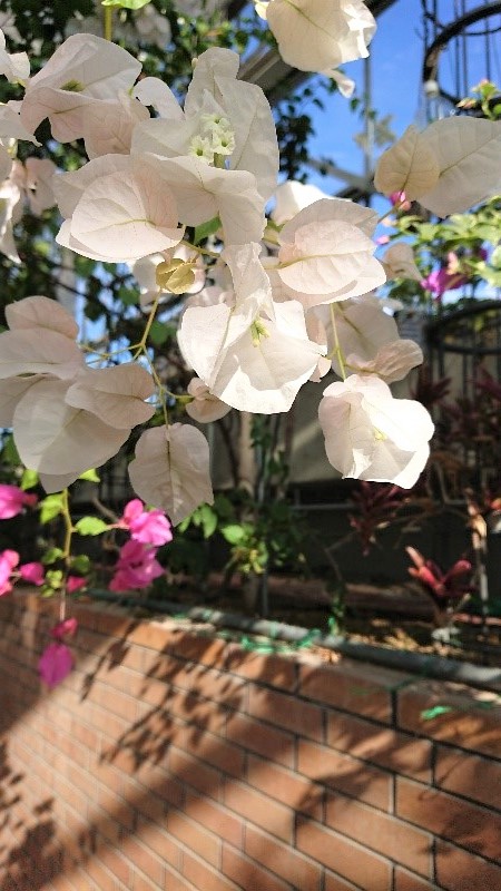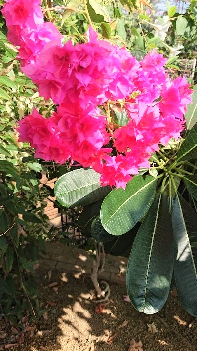 ブーゲンビレアには15種ほどの野生種があるんだけど、現在栽培されているブーゲンビレアのほとんどは、そのうちの3種を交配して育成された園芸品種なんだ。熱帯植物だから寒さには弱いように消えるけど、意外と耐寒性があって、「サンデリアナ」と呼ばれている在来品種などは、